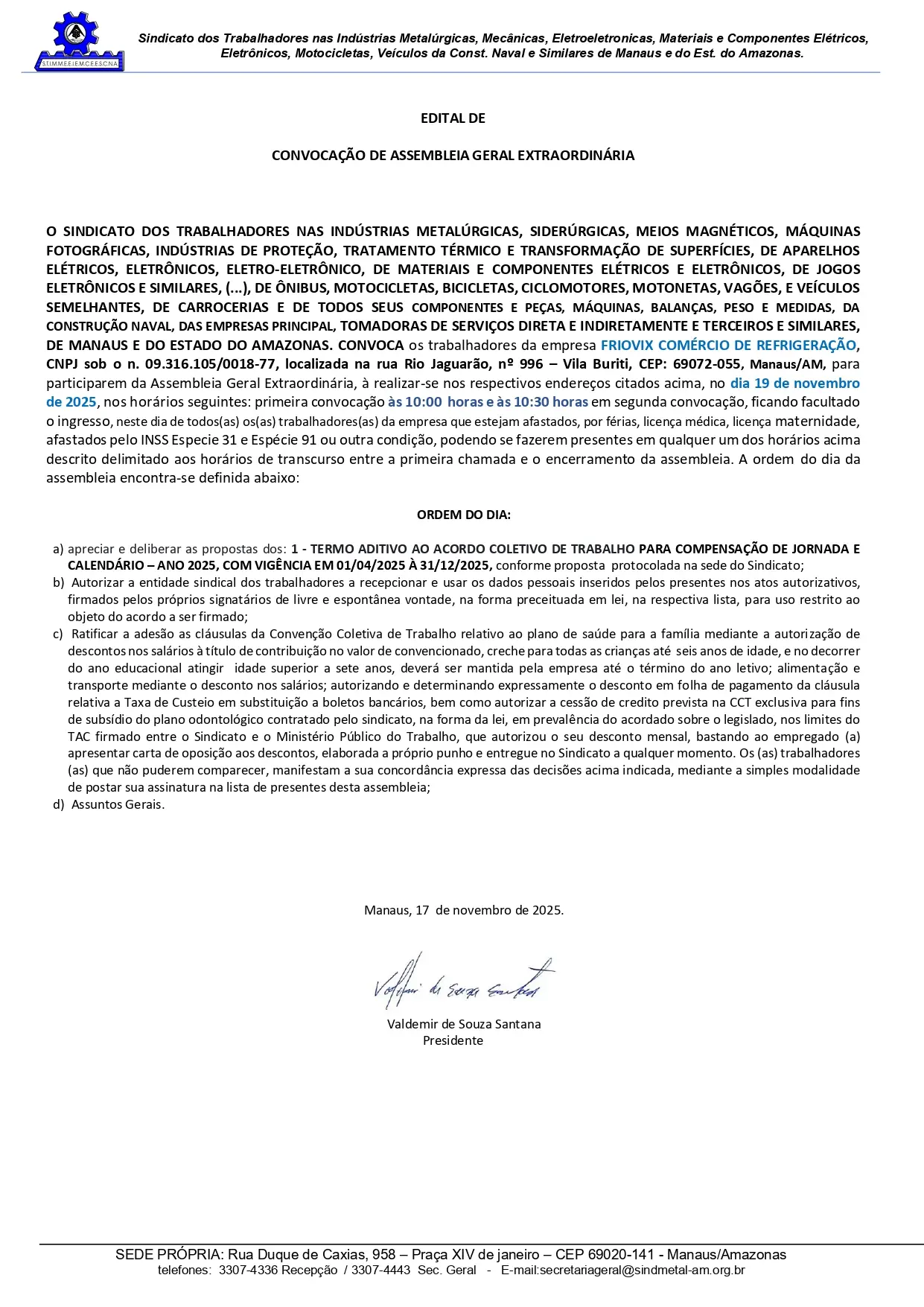 CONVOCAMOS OS TRABALHADORES PERTENCENTES A EMPRESA FRIOVIX COMÉRCIO DE REFRIGERAÇÃO, CNPJ Nº . 09.316.105/0018-77, LOCALIZADA NA RUA RIO JAGUARÃO, Nº 996 – VILA BURITI, CEP: 69072-055 CEP: 69072-055 – MANAUS-AM, PARA PARTICIPAREM DA ASSEMBLEIA GERAL EXTRAORDINÁRIA, À REALIZAR-SE NO RESPECTIVO ENDEREÇO CITADO ACIMA, NO DIA 19 DE NOVEMBRO DE 2025, NOS SEGUINTES HORÁRIOS: PRIMEIRA CONVOCAÇÃO ÀS 10H00 HORAS E ÀS 10h30 MINUTOS EM SEGUNDA CONVOCAÇÃO.