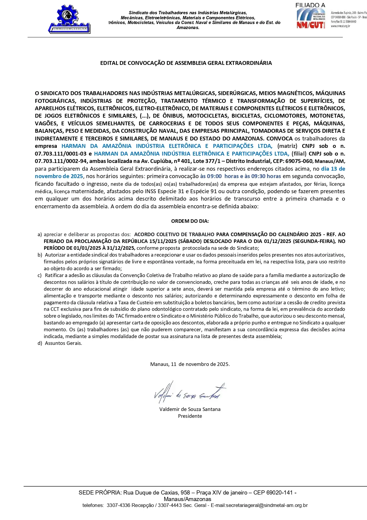 ONVOCAMOS OS TRABALHADORES PERTENCENTES A EMPRESA HARMAN DA AMAZÔNIA INDÚSTRIA ELETRÔNICA E PARTICIPAÇÕES LTDA (matriz), CNPJ Nº 07.703.111/0001-03 E HARMAN DA AMAZÔNIA INDÚSTRIA ELETRÔNICA E PARTICIPAÇÕES LTDA (filial), CNPJ Nº 07.703.111/0002-94, LOCALIZADA NA AVENIDA CUPIÚBA, Nº 401, LOTE 377/1 – DISTRITO INDUSTRIAL – CEP 69.075-060 – MANAUS/AM, PARA PARTICIPAREM DA ASSEMBLEIA GERAL EXTRAORDINÁRIA, À REALIZAR-SE NO RESPECTIVO ENDEREÇO CITADO ACIMA, NO DIA 13 DE NOVEMBRO DE 2025, NOS SEGUINTES HORÁRIOS: PRIMEIRA CONVOCAÇÃO ÀS 09h00 HORAS E ÀS 09h30 MINUTOS EM SEGUNDA CONVOCAÇÃO.