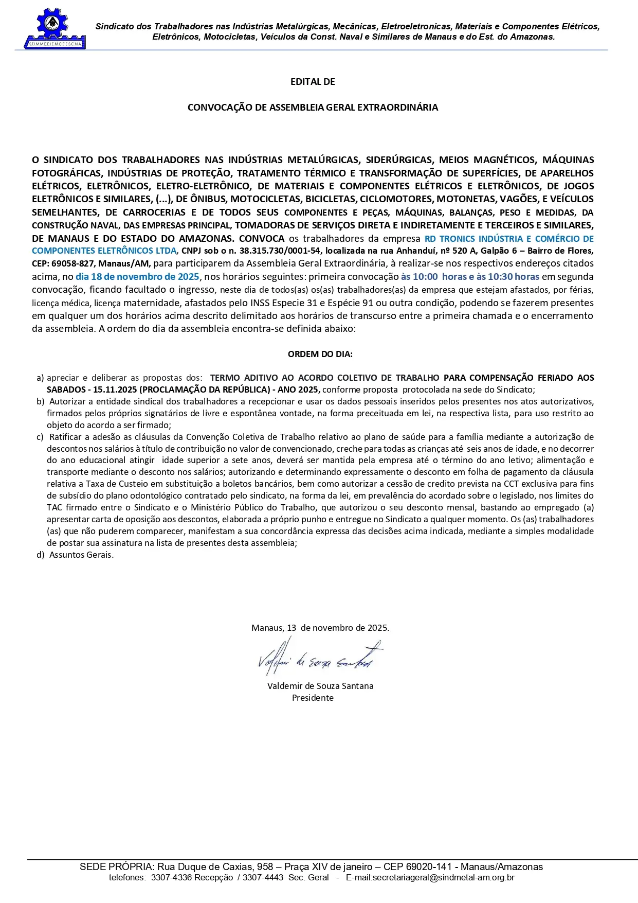 CONVOCAMOS OS TRABALHADORES PERTENCENTES A EMPRESA RD TRONICS INDÚSTRIA E COMÉRCIO DE COMPONENTES ELETRÔNICOS LTDA, CNPJ Nº 38.315.730/0001-54, LOCALIZADA NA RUA ANHANDUÍ, Nº 520-A, GALPÃO 6, BAIRRO FLORES, CEP 69058-827 – MANAUS-AM, PARA PARTICIPAREM DA ASSEMBLEIA GERAL EXTRAORDINÁRIA, À REALIZAR-SE NO RESPECTIVO ENDEREÇO CITADO ACIMA, NO DIA 18 DE NOVEMBRO DE 2025, NOS SEGUINTES HORÁRIOS: PRIMEIRA CONVOCAÇÃO ÀS 10H00 HORAS E ÀS 10h30 MINUTOS EM SEGUNDA CONVOCAÇÃO.