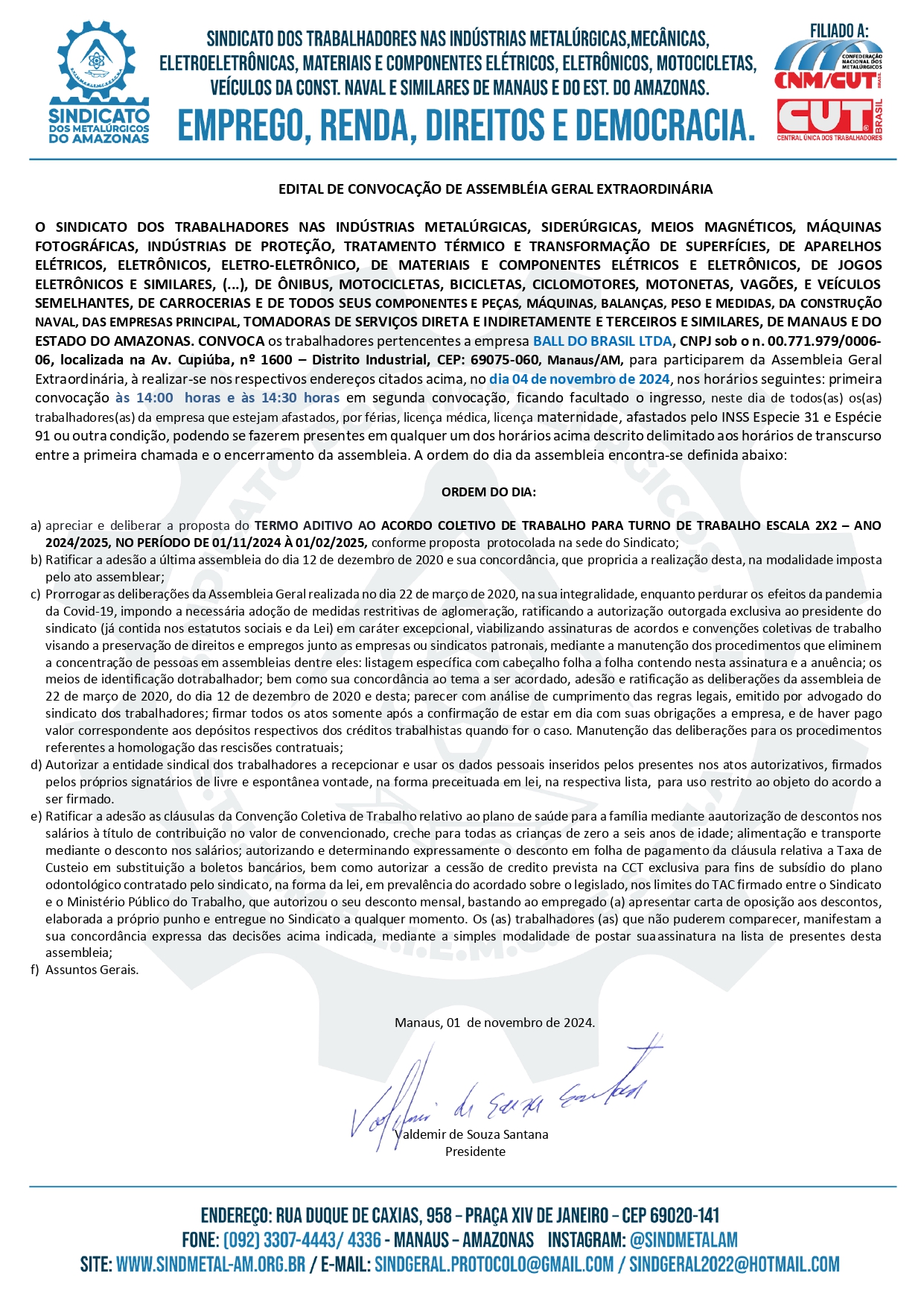 CONVOCAMOS OS TRABALHADORES PERTENCENTES A EMPRESA BALL DO BRASIL LTDA, CNPJ Nº 00.771.979/0006-06, LOCALIZADA NA AV. CUPIÚBA, Nº 1.600 – DISTRITO INDUSTRIAL, CEP 69075-060 – MANAUS-AM, PARA PARTICIPAREM DA ASSEMBLEIA GERAL EXTRAORDINÁRIA, À REALIZAR-SE NO RESPECTIVO ENDEREÇO CITADO ACIMA, NO DIA 04 de NOVEMBRO DE 2024, NOS SEGUINTES HORÁRIOS: PRIMEIRA CONVOCAÇÃO ÀS 14h00 HORAS E ÀS 14h30 MINUTOS EM SEGUNDA CONVOCAÇÃO.