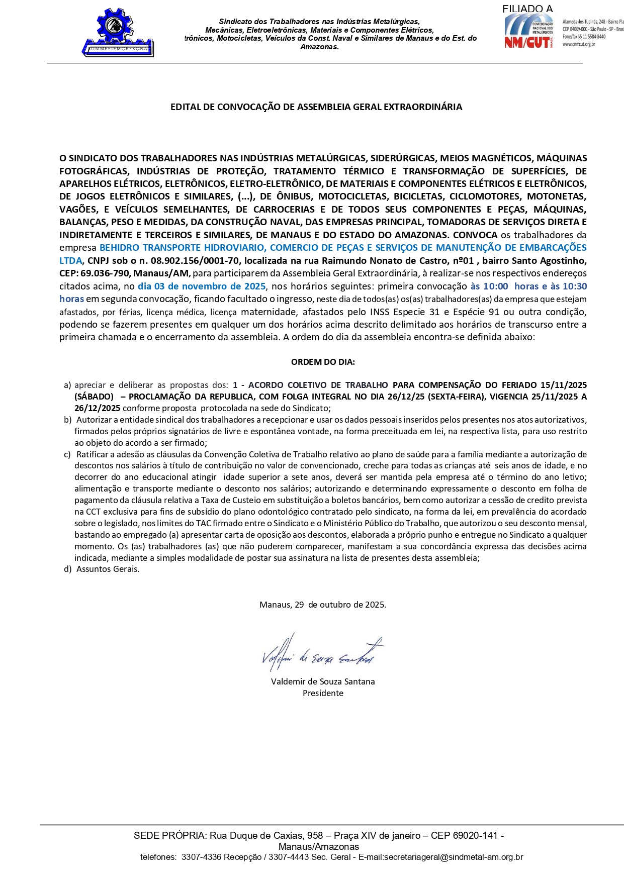 CONVOCAMOS OS TRABALHADORES PERTENCENTES A EMPRESA BEHIDRO TRANSPORTE HIDROVIARIO, COMERCIO DE PEÇAS E SERVIÇOS DE MANUTENÇÃO DE EMBARCAÇÕES LTDA, CNPJ SOB O N . 08.902.156/0001-70, LOCALIZADA NA RUA RAIMUNDO NONATO DE CASTRO, nº01 , BAIRRO SANTO AGOSTINHO, CEP: 69.036-790, MANAUS/AM, PARA PARTICIPAREM DA ASSEMBLEIA GERAL EXTRAORDINÁRIA, À REALIZAR-SE NOS RESPECTIVOS ENDEREÇOS CITADOS ACIMA, NO DIA 03 DE NOVEMBRO DE 2025, NOS HORÁRIOS SEGUINTES: PRIMEIRA CONVOCAÇÃO ÀS 10:00h E ÀS 10h:30m EM SEGUNDA CONVOCAÇÃO.