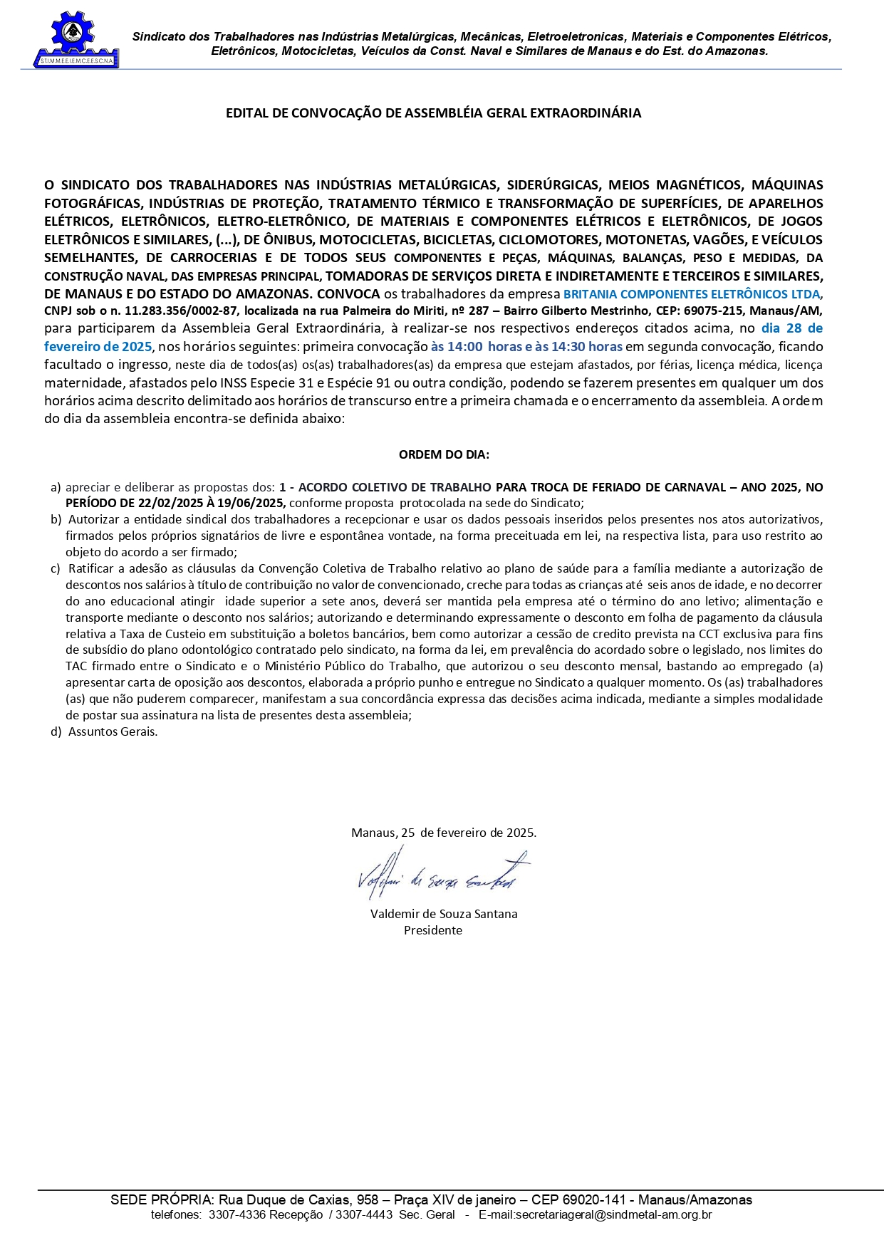 CONVOCAMOS OS TRABALHADORES PERTENCENTES A EMPRESA BRITÂNIA COMPONENETES ELETRÔNICOS LTDA, CNPJ 13.699.433/0001-29, LOCALIZADA NA RUA PALMEIRA DO MIRITI, 287, ALA A, GILBERTO MESTRINHO, MANAUS/AM, PARA PARTICIPAREM DA ASSEMBLEIA GERAL EXTRAORDINÁRIA, A REALIZAR-SE NO RESPECTIVO ENDEREÇO CITADO ACIMA, NO DIA 28 DE FEVEREIRO DE 2025, CONFORME A SEGUIR: PRIMEIRA CONVOCAÇÃO ÀS 14h00 HORAS E ÀS 14h30 MINUTOS EM SEGUNDA CONVOCAÇÃO.