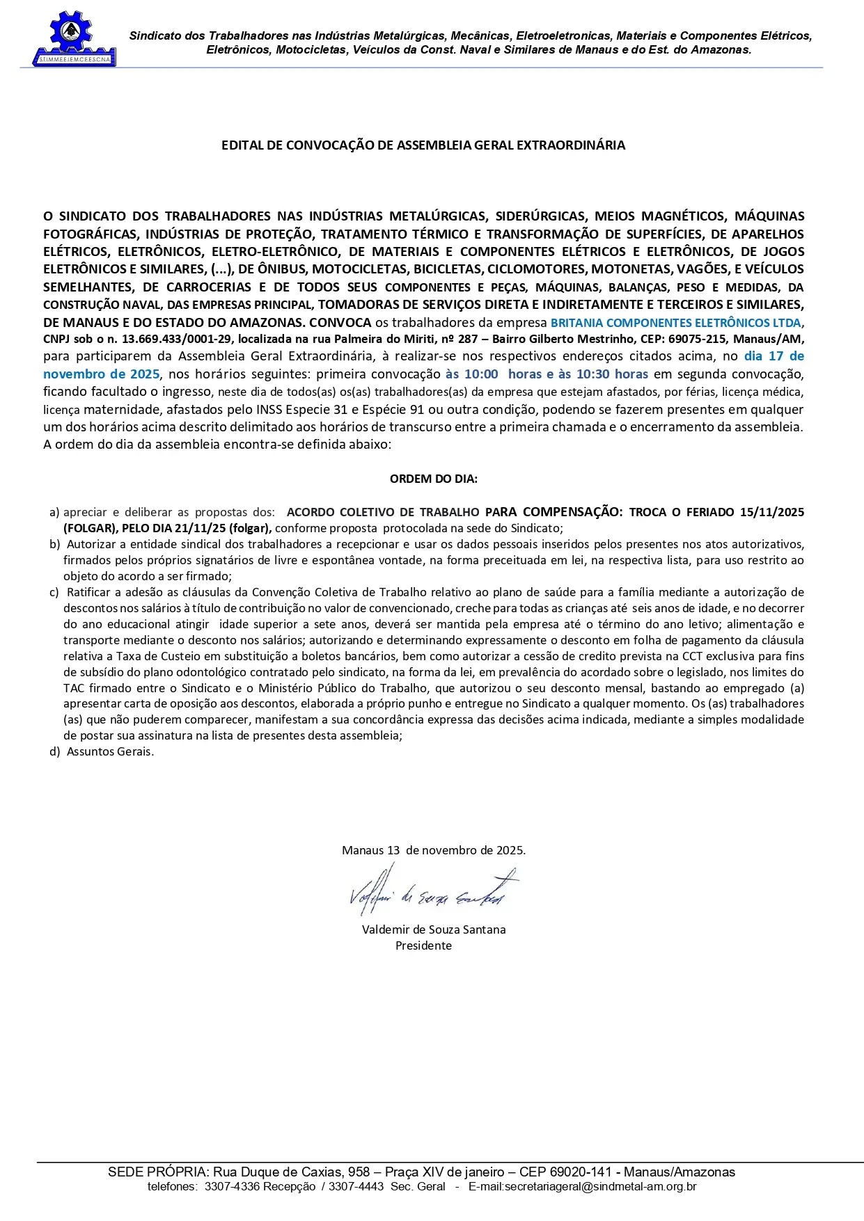 CONVOCAMOS OS TRABALHADORES PERTENCENTES A EMPRESA BRITÂNIA COMPONENETES ELETRÔNICOS LTDA, CNPJ 13.699.433/0001-29, LOCALIZADA NA RUA PALMEIRA DO MIRITI, 287, – BAIRRO GILBERTO MESTRINHO, CEP: 69075-215, MANAUS/AM, PARA PARTICIPAREM DA ASSEMBLEIA GERAL EXTRAORDINÁRIA, A REALIZAR-SE NO RESPECTIVO ENDEREÇO CITADO ACIMA, NO DIA 17 DE NOVEMBRO DE 2025, CONFORME A SEGUIR: PRIMEIRA CONVOCAÇÃO ÀS 10h00 HORAS E ÀS 10h30 MINUTOS EM SEGUNDA CONVOCAÇÃO.