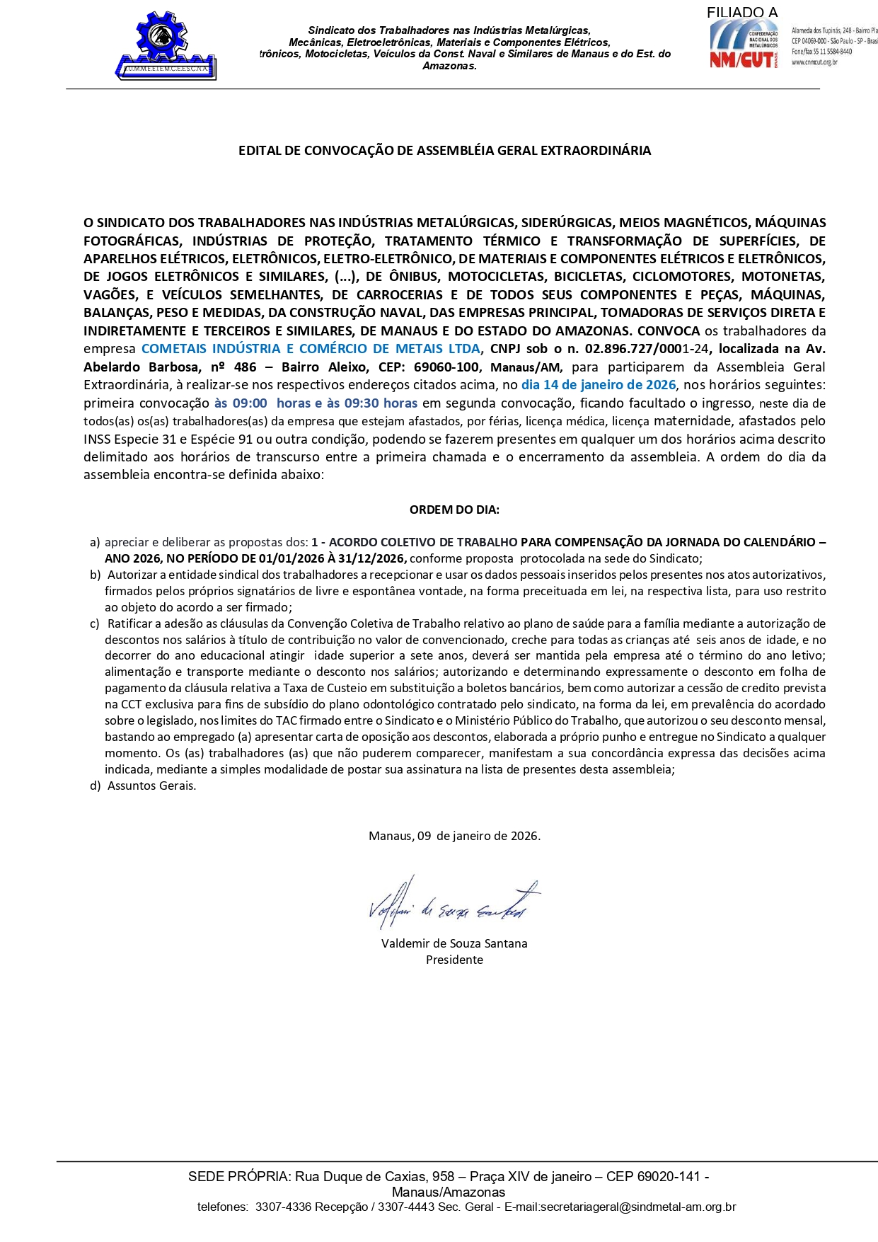 CONVOCAMOS OS TRABALHADORES PERTENCENTES A EMPRESA COMETAIS INDÚSTRIA E COMÉRCIO DE METAIS LTDA, CNPJ Nº 02.896.727/0003-96, SEDIADA NA RUA BAMBUZINHO, Nº 831, BAIRRO DISTRITO INDUSTRIAL II, CEP 69075-846 – MANAUS-AM, PARA PARTICIPAREM DA ASSEMBLEIA GERAL EXTRAORDINÁRIA, À REALIZAR-SE NO RESPECTIVO ENDEREÇO CITADO ACIMA, NO DIA 14 DE JANEIRO DE 2026, NOS SEGUINTES HORÁRIOS: PRIMEIRA CONVOCAÇÃO ÀS 09h00 HORAS E ÀS 09h30 MINUTOS EM SEGUNDA CONVOCAÇÃO.