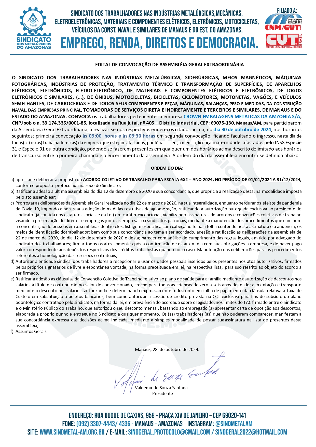 CONVOCAMOS OS TRABALHADORES PERTENCENTES A EMPRESA CROWN EMBALAGENS METÁLICAS DA AMAZÔNIA S/A, CNPJ 33.174.335/0001-85, LOCALIZADA NA RUA JAVARI, Nº 405, DISTRITO INDUSTRIAL, CEP 69075-130, MANAUS/AM, PARA PARTICIPAREM DA ASSEMBLEIA GERAL EXTRAORDINÁRIA, A REALIZAR-SE NO RESPECTIVO ENDEREÇO CITADO ACIMA, NO DIA 30 DE OUTUBBRO DE 2024, NOS SEGUINTES HORÁRIOS: PRIMEIRA CONVOCAÇÃO ÀS 09h00 HORAS E ÀS 09h30 MINUTOS EM SEGUNDA CONVOCAÇÃO.