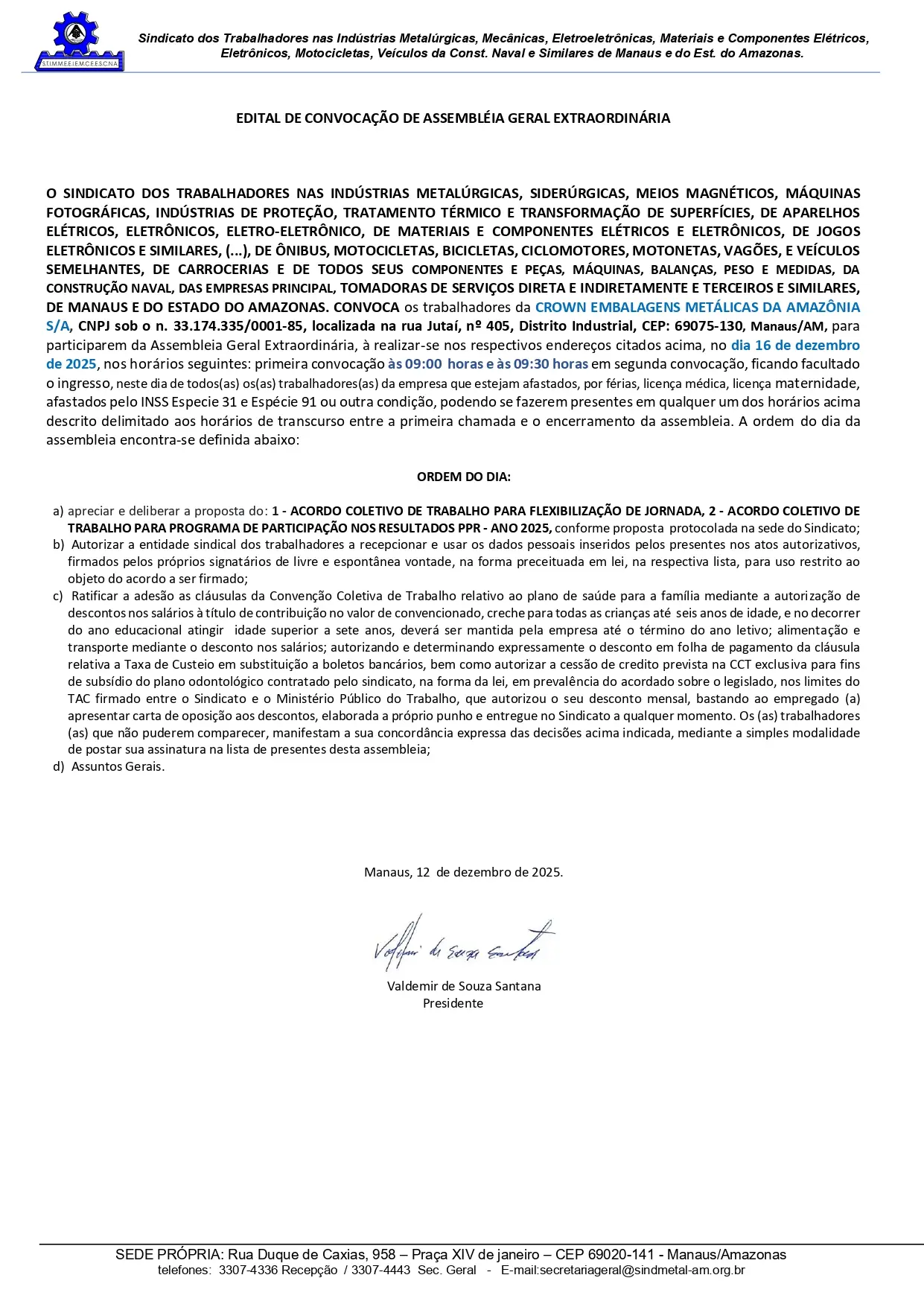 CONVOCAMOS OS TRABALHADORES PERTENCENTES A EMPRESA CROWN EMBALAGENS METÁLICAS DA AMAZÔNIA S/A, CNPJ 33.174.335/0001-85, LOCALIZADA NA RUA JAVARI, Nº 405, DISTRITO INDUSTRIAL, CEP 69075-130, MANAUS/AM, PARA PARTICIPAREM DA ASSEMBLEIA GERAL EXTRAORDINÁRIA, A REALIZAR-SE NO RESPECTIVO ENDEREÇO CITADO ACIMA, NO DIA 16 DE DEZEMBRO DE 2025, NOS SEGUINTES HORÁRIOS: PRIMEIRA CONVOCAÇÃO ÀS 09h00 HORAS E ÀS 09h30 MINUTOS EM SEGUNDA CONVOCAÇÃO.