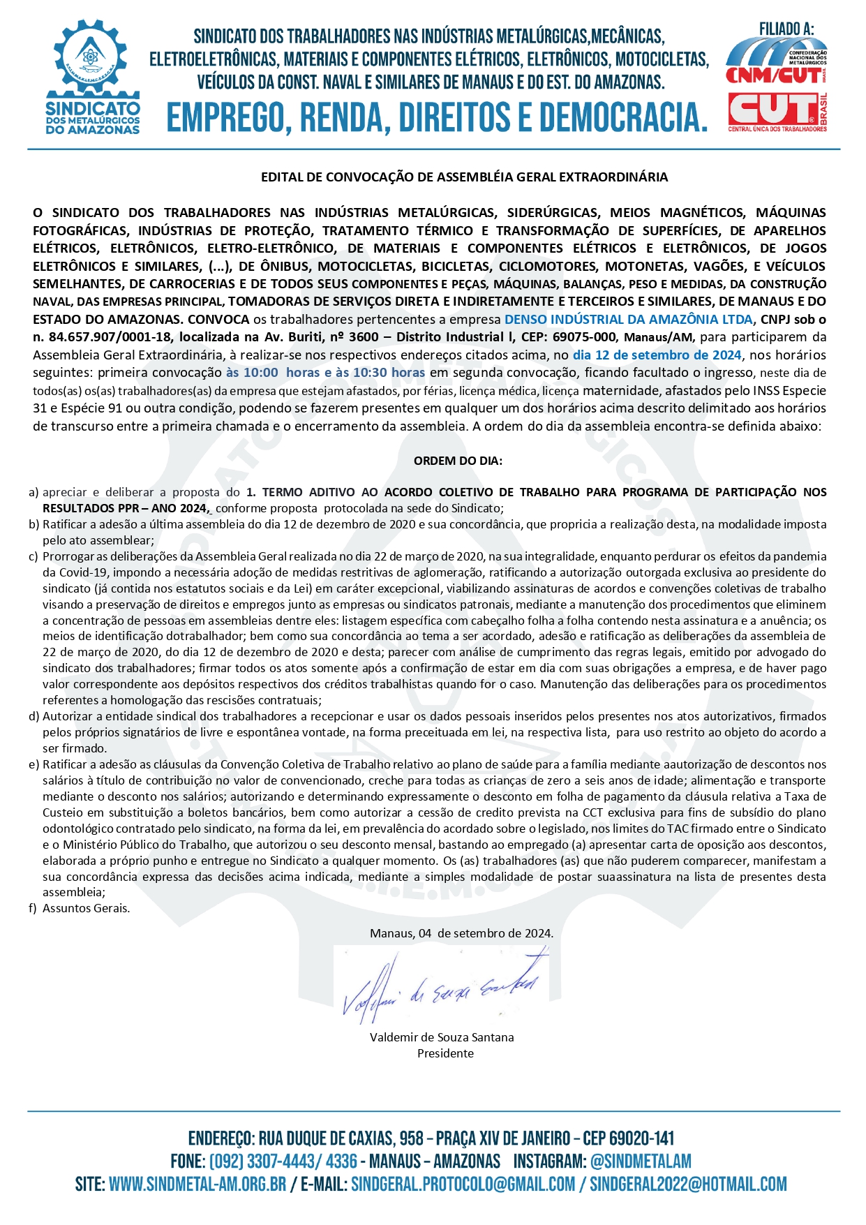 CONVOCAMOS OS TRABALHADORES PERTENCENTES A EMPRESA DENSO INDUSTRIAL DA AMAZÔNIA LTDA, CNPJ Nº 84.657.907/0001-18, LOCALIZADA NA AVENIDA BURITI, Nº 3.600 – DISTRITO INDUSTRIAL I, CEP 69.075-000 – MANAUS/AM, PARA PARTICIPAREM DA ASSEMBLEIA GERAL EXTRAORDINÁRIA, À REALIZAR-SE NO RESPECTIVO ENDEREÇO CITADO ACIMA, NO DIA 12 DE SETEMBRO DE 2024, NOS SEGUINTES HORÁRIOS: PRIMEIRA CONVOCAÇÃO ÀS 10h00 HORAS E ÀS 10h30 MINUTOS EM SEGUNDA CONVOCAÇÃO.