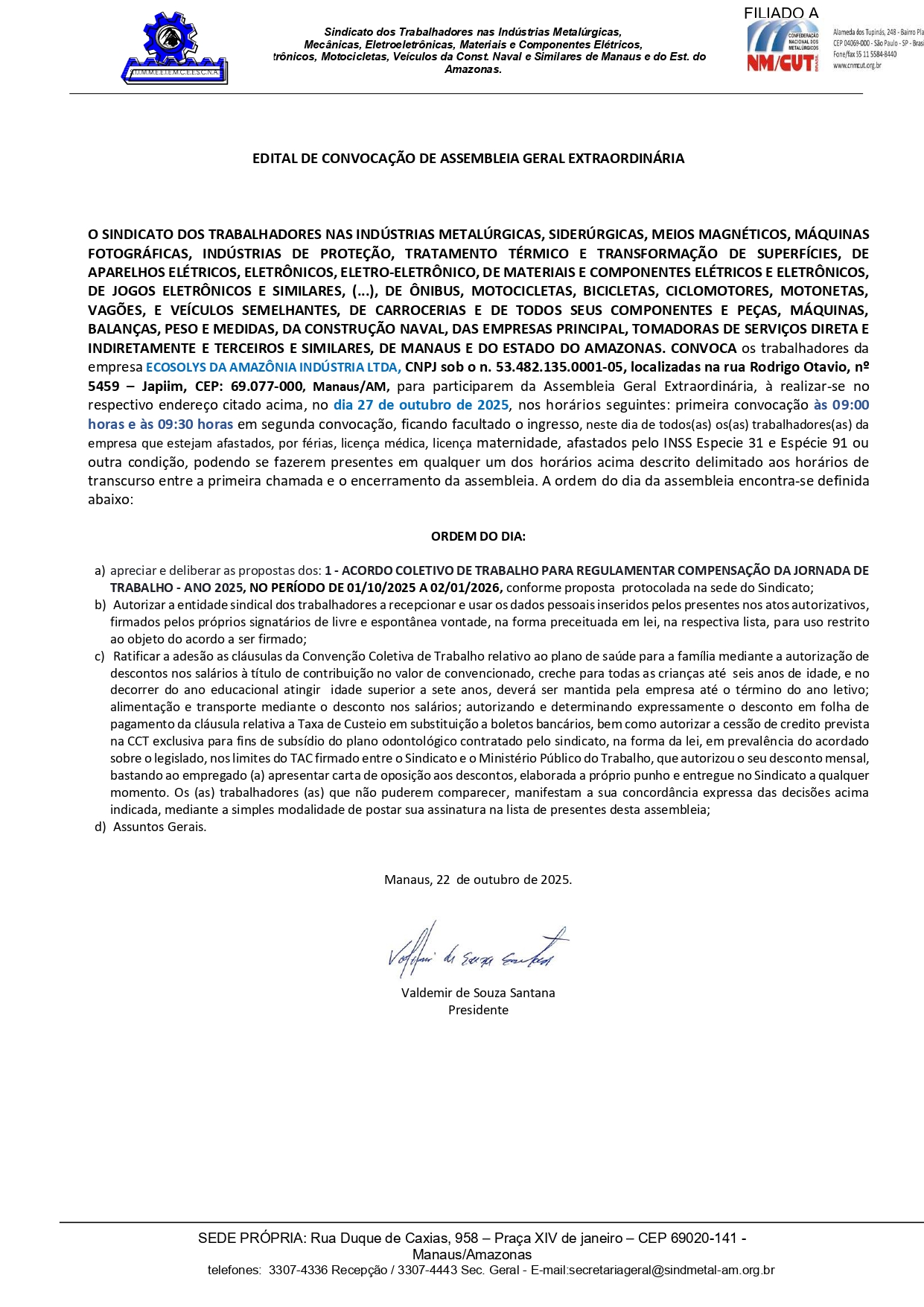 CONVOCAMOS OS TRABALHADORES PERTENCENTES DA EMPRESA ECOSOLYS DA AMAZÔNIA INDÚSTRIA LTDA, CNPJ SOB O Nº 53.482.135.0001-05, LOCALIZADAS NA RUA RODRIGO OTAVIO, Nº 5459 – JAPIIM, CEP: 69.077-000, MANAUS/AM, PARA PARTICIPAREM DA ASSEMBLEIA GERAL EXTRAORDINÁRIA, À REALIZAR-SE NA RUA RODRIGO OTAVIO, nº 5459 – JAPIIM, CEP: 69.077-000, Manaus/AM, , NO DIA 27 DE OUTUBRO DE 2025, NOS HORÁRIOS SEGUINTES: PRIMEIRA CONVOCAÇÃO ÀS 09:00 HORAS E ÀS 09:30 HORAS EM SEGUNDA CONVOCAÇÃO.