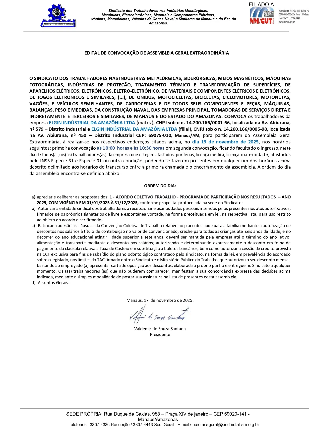 CONVOCAMOS OS TRABALHADORES PERTENCENTES A EMPRESA ELGIN INDUSTRIAL DA AMAZÔNIA LTDA (matriz), INSCRIÇÃO MATRIZ, DE CNPJ 14.200.166/0001-66, LOCALIZADA NA AVENIDA ABIURANA Nº 579, DISTRITO INDUSTRIAL, CEP 69075-010, MANAUS/AM, E ELGIN INDUSTRIAL DA AMAZÔNIA LTDA (filial), INSCRIÇÃO FILIAL CNPJ 14.200.166/0005-90, LOCALIZADA NA AVENIDA ABIURANA Nº 450, DISTRITO INDUSTRIAL, CEP 69075-010, MANAUS/AM, PARA PARTICIPAREM DA ASSEMBLEIA GERAL EXTRAORDINÁRIA, À REALIZAR-SE NOS RESPECTIVOS ENDEREÇOS CITADOS ACIMA, NO DIA 19 DE NOVEMBRO DE 2025, NOS SEGUINTES HORÁRIOS: PRIMEIRA CONVOCAÇÃO ÀS 10h00 HORAS E ÀS 10h30 MINUTOS EM SEGUNDA CONVOCAÇÃO.