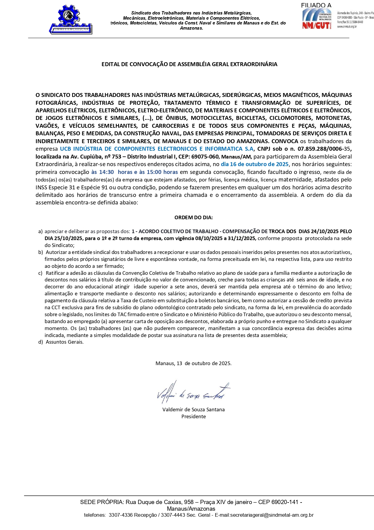 CONVOCAMOS OS TRABALHADORES PERTENCENTES A EMPRESA UCB INDÚSTRIA DE COMPONENTES ELETRÔNICOS E INFORMÁTICA S/A, CNPJ SOB O N. 07.859.288/0006- 03, LOCALIZADA NA AV. CUPIÚBA, Nº 753 – DISTRITO INDUSTRIAL I, CEP: 69075-060, MANAUS/AM, PARA PARTICIPAREM DA ASSEMBLEIA GERAL EXTRAORDINÁRIA, À REALIZAR-SE NOS RESPECTIVOS ENDEREÇOS CITADOS ACIMA, NO DIA 16 DE OUTUBRO DE 2025, NOS HORÁRIOS SEGUINTES: PRIMEIRA CONVOCAÇÃO ÀS 14:30H HORAS E ÀS 15:00H, EM SEGUNDA CONVOCAÇÃO.