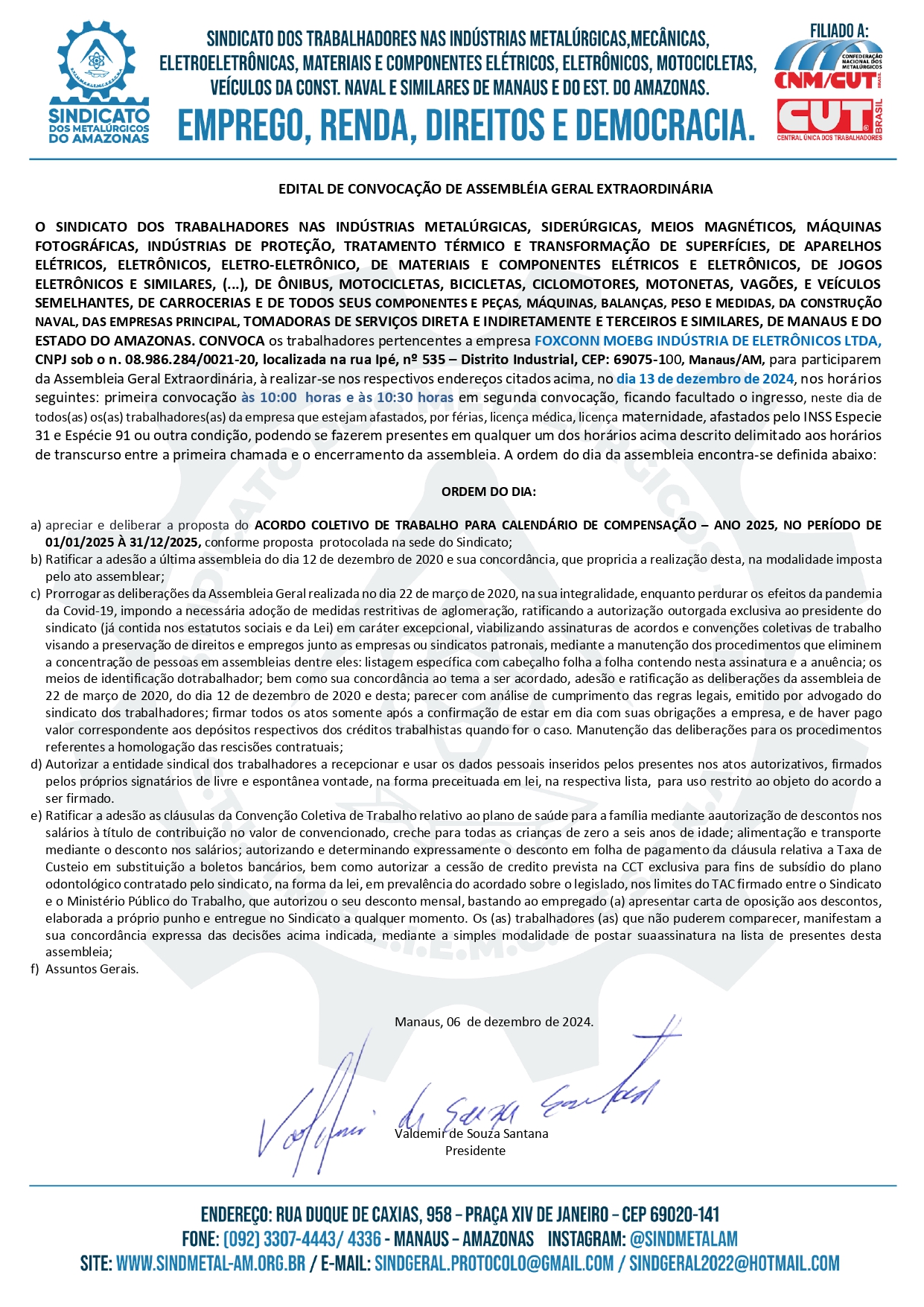 CONVOCAMOS OS TRABALHADORES PERTENCENTES A EMPRESA FOXCONN MOEBG INDÚSTRIA DE ELETRÔNICOS LTDA, CNPJ Nº 08.986.284/0001-49, LOCALIZADA NA AVENIDA AÇAI, Nº 1580-A, DISTRITO INDUSTRIAL, CEP 69075-020 – MANAUS/AM, PARA PARTICIPAREM DA ASSEMBLEIA GERAL EXTRAORDINÁRIA, À REALIZAR-SE NO RESPECTIVO ENDEREÇO CITADO ACIMA, NO DIA 13 DE DEZEMBRO DE 2024, NOS SEGUINTES HORÁRIOS: PRIMEIRA CONVOCAÇÃO ÀS 10h00 HORAS E ÀS 10h30 MINUTOS EM SEGUNDA CONVOCAÇÃO.
