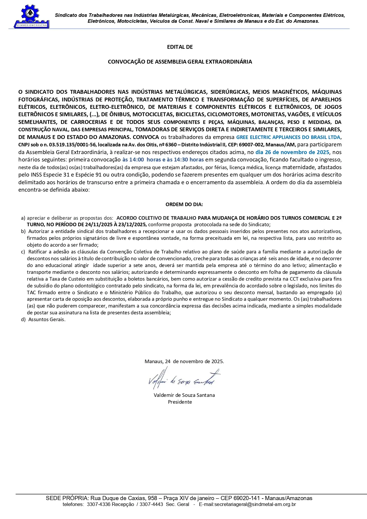CONVOCAMOS OS TRABALHADORES PERTENCENTES A EMPRESA GREE ELECTRIC APPLIANCES DO BRASIL LTDA, CNPJ 03.519.135/0001-56, LOCALIZADA NA AVENIDA DOS OITIS, Nº 6360, DISTRITO INDUSTRIAL II, CEP 69007-002, MANAUS/AM, PARA PARTICIPAREM DA ASSEMBLEIA GERAL EXTRAORDINÁRIA, A REALIZAR-SE NO RESPECTIVO ENDEREÇO CITADO ACIMA, NO DIA 26 DE NOVEMBRO DE 2025, CONFORME HORÁRIO SEGUINTES: PRIMEIRA CONVOCAÇÃO ÀS 14h00 HORAS E ÀS 14h30 MINUTOS EM SEGUNDA CONVOCAÇÃO.