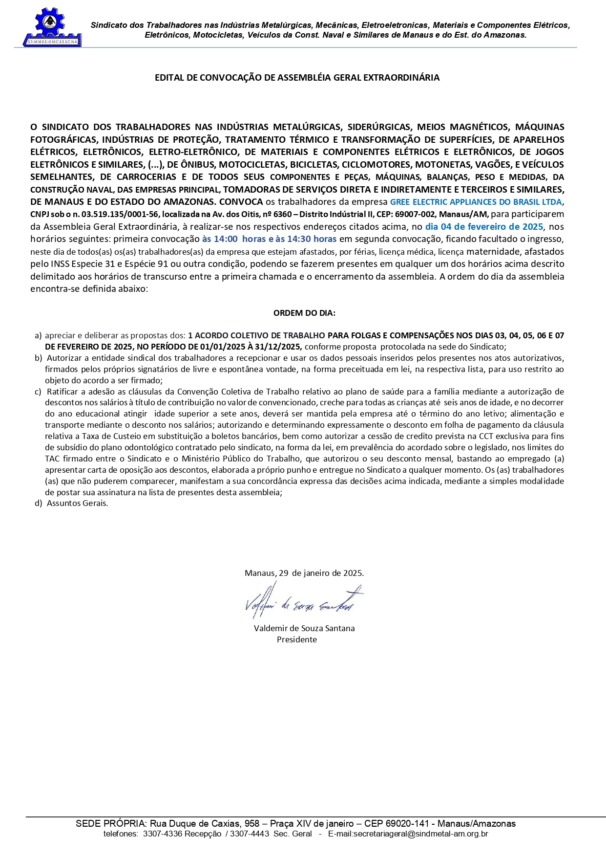 CONVOCAMOS OS TRABALHADORES PERTENCENTES A EMPRESA GREE ELECTRIC APPLIANCES DO BRASIL LTDA, CNPJ 03.519.135/0001-56, LOCALIZADA NA AVENIDA DOS OITIS, Nº 6360, DISTRITO INDUSTRIAL II, CEP 69007-002, MANAUS/AM, PARA PARTICIPAREM DA ASSEMBLEIA GERAL EXTRAORDINÁRIA, A REALIZAR-SE NO RESPECTIVO ENDEREÇO CITADO ACIMA, NO DIA 04 DE FEVEREIRO DE 2025, CONFORME HORÁRIO SEGUINTES: PRIMEIRA CONVOCAÇÃO ÀS 14h00 MINUTOS E ÀS 14h30 HORAS EM SEGUNDA CONVOCAÇÃO.