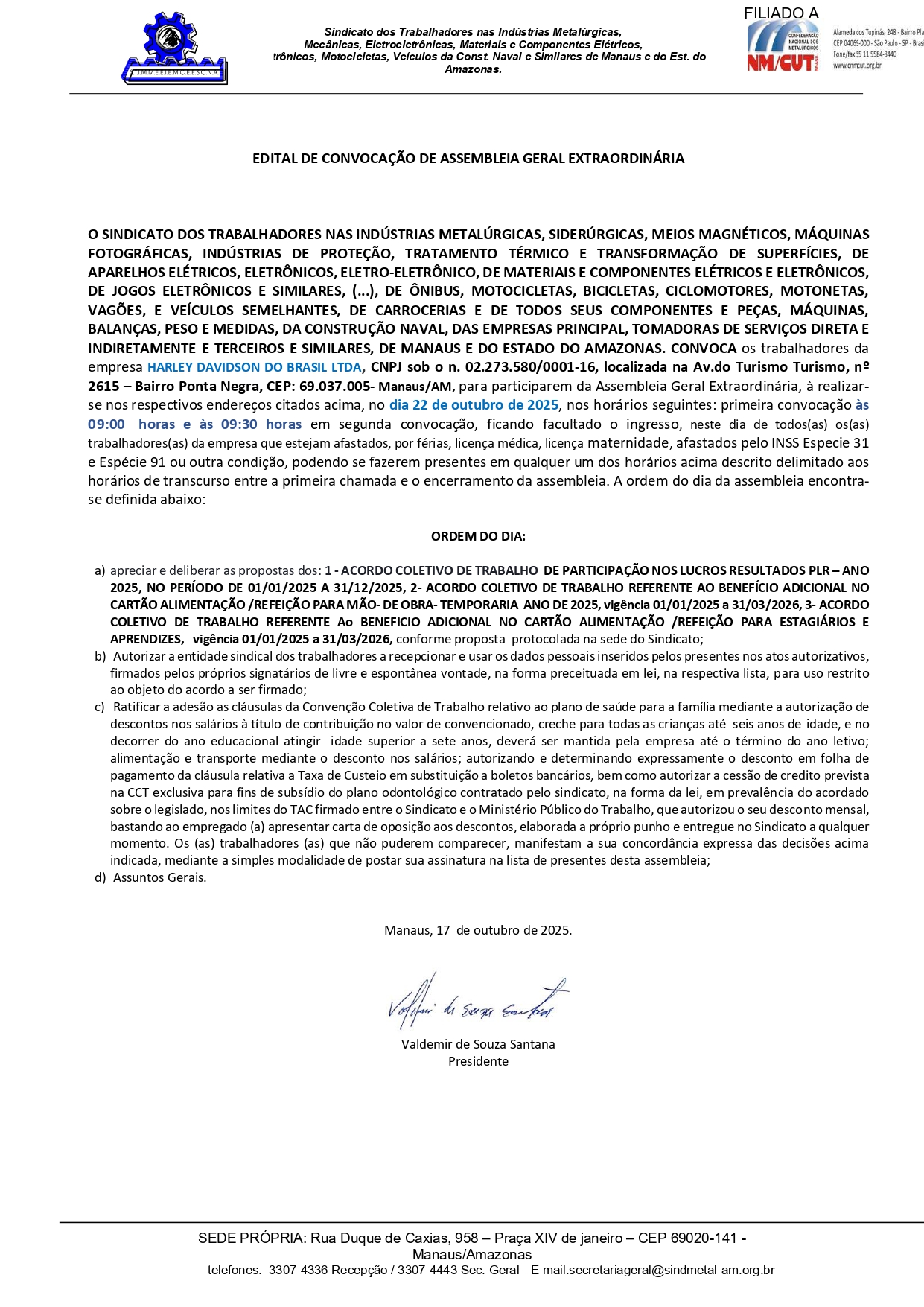 CONVOCAMOS OS TRABALHADORES PERTENCENTES A EMPRESA HARLEY-DAVIDSON DO BRASIL LTDA, CNPJ 02.273.580/0001-16, LOCALIZADA NA AV. DO TURISMO, 2615, BAIRRO PONTA NEGRA, CEP 69037-005, MANAUS/AM, PARA PARTICIPAREM DA ASSEMBLEIA GERAL EXTRAORDINÁRIA, A REALIZAR-SE NO RESPECTIVO ENDEREÇO CITADO ACIMA, NO DIA 22 DE OUTUBRO DE 2025, NOS SEGUINTES HORÁRIOS: PRIMEIRA CONVOCAÇÃO ÀS 09h00 HORAS E ÀS 09h30 MINUTOS EM SEGUNDA CONVOCAÇÃO.
