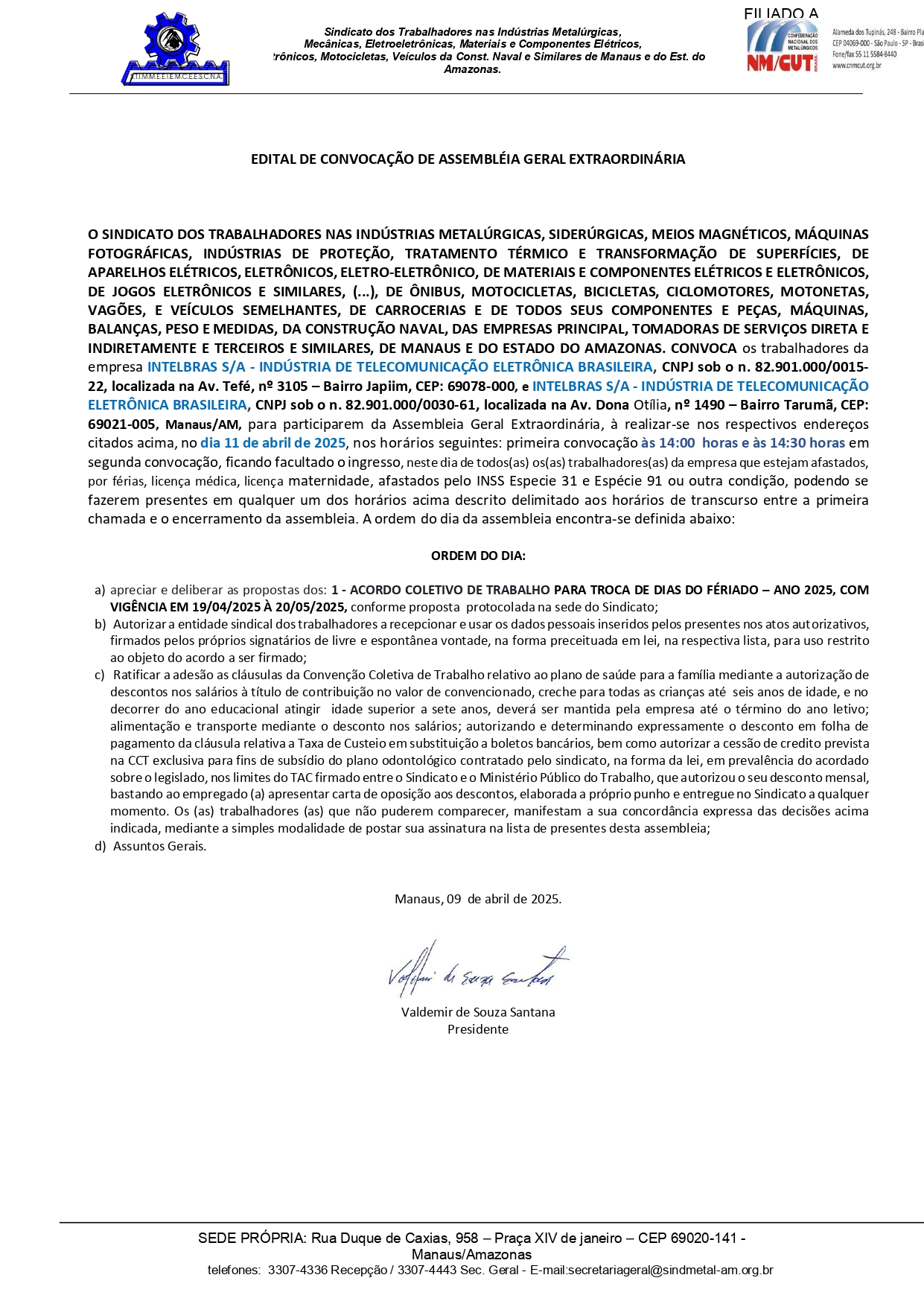 CONVOCAMOS OS TRABALHADORES PERTENCENTES A EMPRESA INTELBRAS S/A – INDÚSTRIA DE TELECOMUNICAÇÃO ELETRÔNICA BRASILEIRA, CNPJ SOB O N. 82.901.000/0015-22, LOCALIZADA NA AV. TEFÉ, Nº 3105 – BAIRRO JAPIIM, CEP: 69078-000, MANAUS/AM e INTELBRAS S/A – INDÚSTRIA DE TELECOMUNICAÇÃO ELETRÔNICA BRASILEIRA, CNPJ sob o n. 82.901.000/0030-61, localizada na Av. Dona Otilia, nº 1490 – Bairro Tarumã, CEP: 69021-005, Manaus/AM PARA PARTICIPAREM DA ASSEMBLEIA GERAL EXTRAORDINÁRIA, À REALIZAR-SE NOS RESPECTIVOS ENDEREÇOS CITADOS ACIMA, NO DIA 11 DE ABRIL DE 2025, NOS HORÁRIOS SEGUINTES: PRIMEIRA CONVOCAÇÃO ÀS 14:00 HORAS E ÀS 14:30 MINUTOS EM SEGUNDA CONVOCAÇÃO.