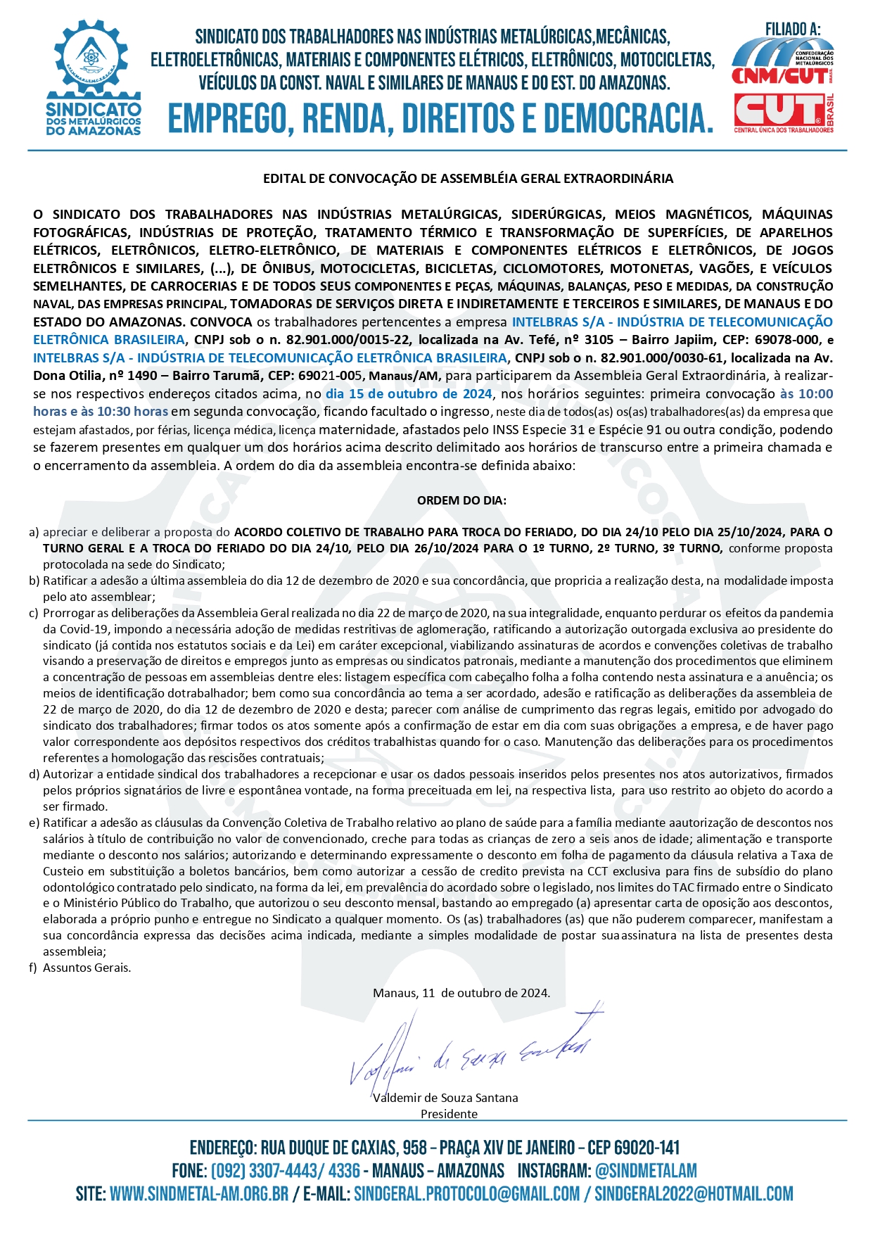 CONVOCAMOS OS TRABALHADORES PERTENCENTES A EMPRESA INTELBRAS S/A – INDÚSTRIA DE TELECOMUNICAÇÃO ELETRÔNICA BRASILEIRA, CNPJ SOB O N. 82.901.000/0015-22, LOCALIZADA NA AV. TEFÉ, Nº 3105 – BAIRRO JAPIIM, CEP: 69078-000, MANAUS/AM, PARA PARTICIPAREM DA ASSEMBLEIA GERAL EXTRAORDINÁRIA, À REALIZAR-SE NOS RESPECTIVOS ENDEREÇOS CITADOS ACIMA, NO DIA 15 DE OUTUBRO DE 2024, NOS HORÁRIOS SEGUINTES: PRIMEIRA CONVOCAÇÃO ÀS 10:00 HORAS E ÀS 10:30 MINUTOS EM SEGUNDA CONVOCAÇÃO.