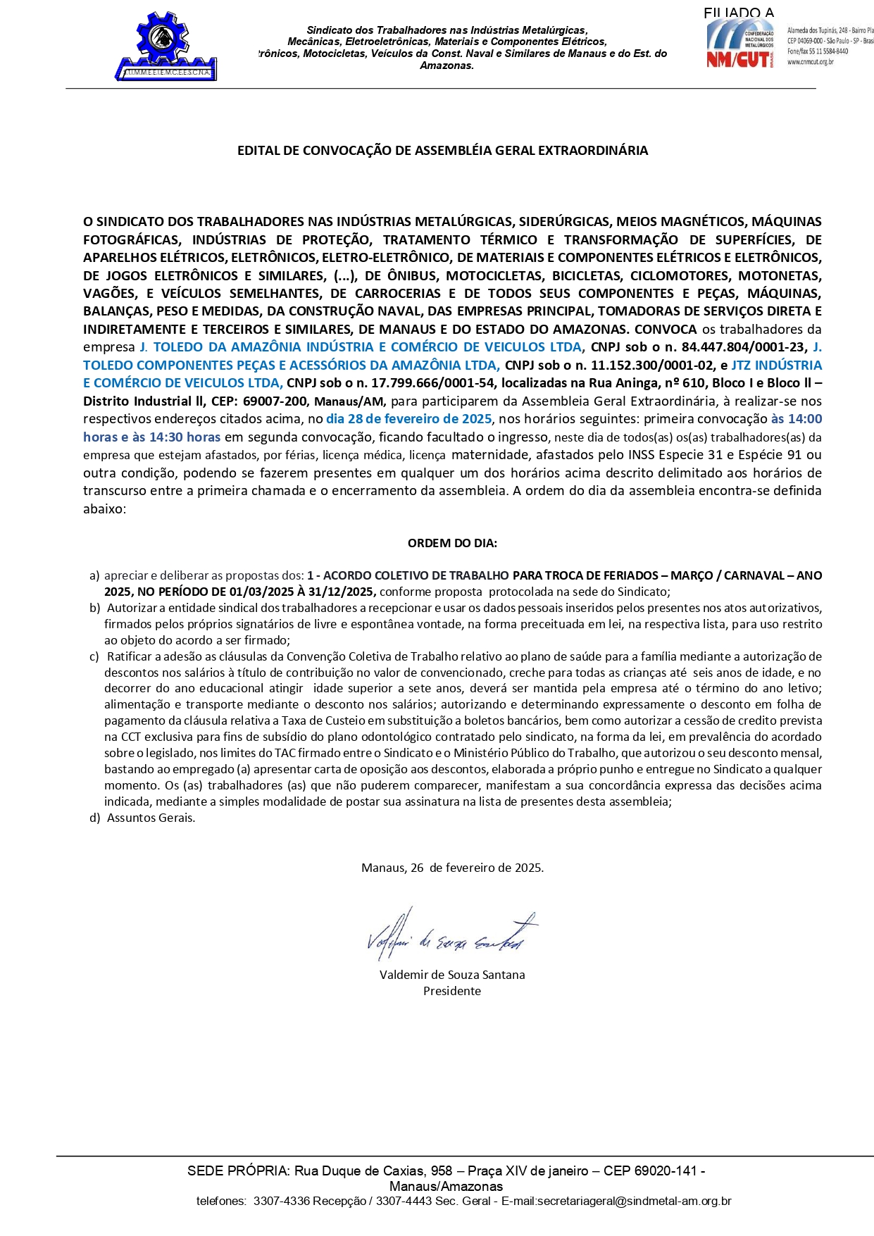 CONVOCAMOS OS TRABALHADORES PERTENCENTES AS EMPRESAS J. TOLEDO INDÚSTRIA E COMÉRCIO DE VEÍCULOS LTDA. (JTA), CNPJ 84.447.804/0002-0; J. TOLEDO COMPONENTES, PEÇAS E ACESSÓRIOS DA AMAZÔNIA LTDA (JTCA), CNPJ 11.152.300/0001-02 E JTZ INDÚSTRIA E COMÉRCIO DE VEICULOS LTDA; CNPJ 17.779.666/0001-54, TODAS COM SEDE EM MANAUS, ESTADO DO AMAZONAS,NA RUA ANINGA , Nº 610, BLOCO 1 E BLOCO 2, DISTRITO INDUSTRIAL II, MANAUS/AM, CEP 69007-200, PARA PARTICIPAREM DA ASSEMBLEIA GERAL EXTRAORDINÁRIA, À REALIZAR-SE NOS RESPECTIVOS ENDEREÇOS CITADOS ACIMA, NO DIA 28 DE FEVEREIRO DE 2025, NOS HORÁRIOS SEGUINTES: PRIMEIRA CONVOCAÇÃO ÀS 14h00 MINUTOS E ÀS 14h30 HORAS EM SEGUNDA CONVOCAÇÃO.