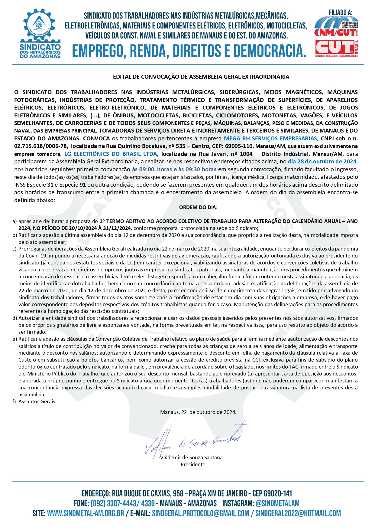CONVOCAMOS OS TRABALHADORES PERTENCENTES A EMPRESA MEGA RH SERVIÇOS EMPRESARIAIS, CNPJ SOB O N. 02.715.618/0006-78, LOCALIZADA NA RUA QUINTINO BOCAIUVA, Nº 535 – CENTRO, CEP: 69005-110, MANAUS/AM, REUNIRAM-SE EM ASSEMBLEIA GERAL EXTRAORDINÁRIA, REALIZADA NO REFEITÓRIO DA TOMADORA DE SERVIÇOS, LG ELECTRÔNICS DO BRASIL LTDA, LOCALIZADA NA RUA JAVARI, Nº 1004 – DISTRITO INDÚSTRIAL, MANAUS/AM, NO DIA 28 DE OUTUBRO DE 2024, NOS HORÁRIOS SEGUINTES: PRIMEIRA CONVOCAÇÃO ÀS 09:00 HORAS E ÀS 09:30 MINUTOS EM SEGUNDA CONVOCAÇÃO.