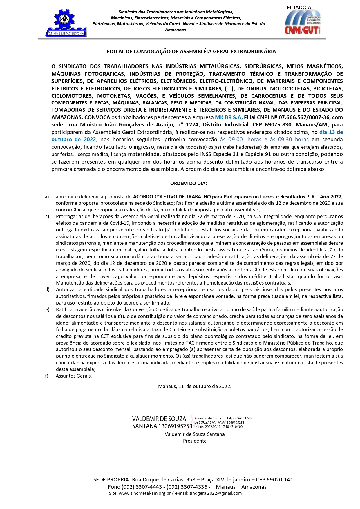 CONVOCAMOS OS TRABALHADORES PERTENCENTES A EMPRESA MK BR S.A, CNPJ Nº 07.666.567/000-36, COM SEDE NA RUA MINISTRO JOÃO GONÇALVES DE ARAÚJO, Nº 1274 – DISTRITO INDUSTRIAL, CEP 69.075-830 – MANAUS/AM, PARA PARTICIPAREM DA ASSEMBLEIA GERAL EXTRAORDINÁRIA, À REALIZAR-SE NO RESPECTIVO ENDEREÇO CITADO ACIMA, NO DIA 13 DE OUTUBRO DE 2022, NOS SEGUINTES HORÁRIOS: PRIMEIRA CONVOCAÇÃO ÀS 09h00 HORAS E ÀS 09h30 MINUTOS EM SEGUNDA CONVOCAÇÃO.