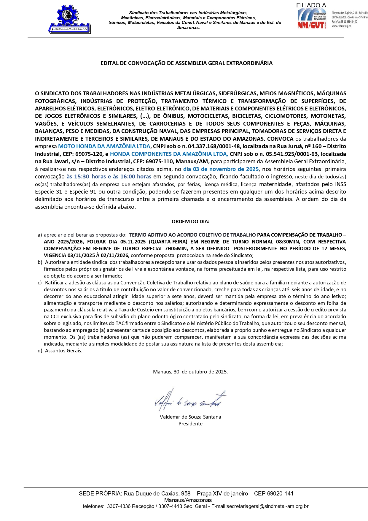 CONVOCAMOS OS TRABALHADORES PERTENCENTES A EMPRESA MOTO HONDA DA AMAZÔNIA LTDA, CNPJ SOB O N. 04.337.168/0001-48, LOCALIZADA NA RUA JURUÁ, Nº 160 – DISTRITO INDUSTRIAL, CEP: 69075-120, E HONDA COMPONENTES DA AMAZÔNIA LTDA, CNPJ SOB O N. 05.541.925/0001-63, LOCALIZADA NA RUA JAVARI, S/N – DISTRITO INDUSTRIAL, CEP: 69075- 110, MANAUS/AM, PARA PARTICIPAREM DA ASSEMBLEIA GERAL EXTRAORDINÁRIA, A REALIZAR-SE NOS RESPECTIVOS ENDEREÇOS CITADOS ACIMA, NO DIA 03 DE NOVEMBRO  DE 2025, NOS HORÁRIOS SEGUINTES:  ÀS 15:30 HORAS, e  ÀS 16:00H.