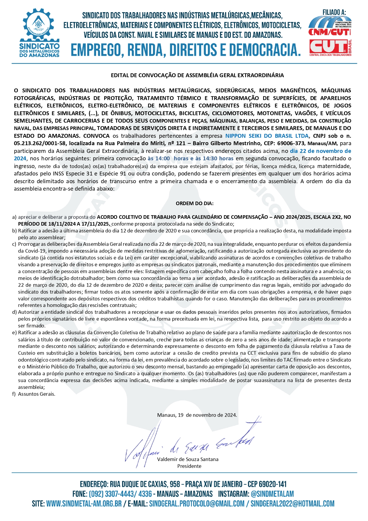 CONVOCAMOS OS TRABALHADORES PERTENCENTES A EMPRESA NIPPON SEIKI DO BRASIL LTDA, CNPJ 05.213.262/0001-58, LOCALIZADA NA RUA PALMEIRA DO MIRITI, 121 – GILBERTO MESTRINHO, CEP 69006-373, MANAUS/AM, PARA PARTICIPAREM DA ASSEMBLEIA GERAL EXTRAORDINÁRIA, A REALIZAR-SE NO RESPECTIVO ENDEREÇO CITADO ACIMA, NO DIA 22 DE NOVEMBRO DE 2024, NOS HORÁRIOS SEGUINTES: PRIMEIRA CONVOCAÇÃO ÀS 14h00 HORAS E ÀS 14h30 MINUTOS EM SEGUNDA CONVOCAÇÃO.