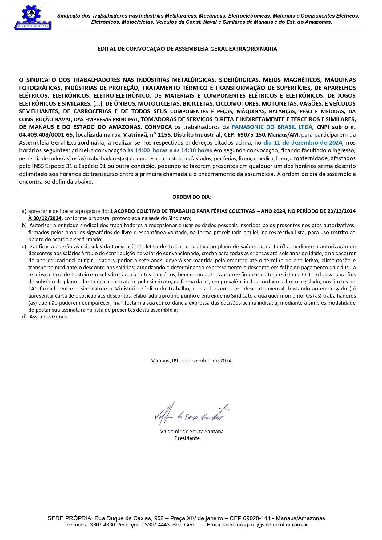 CONVOCAMOS OS TRABALHADORES PERTENCENTES A EMPRESA PANASONIC DO BRASIL LTDA, CNPJ 04.403.408/0001-65, LOCALIZADA NA RUA MATRINXÃ, Nº 1155, DISTRITO INDUSTRIAL, CEP 69075-150, MANAUS/AM, PARA PARTICIPAREM DA ASSEMBLEIA GERAL EXTRAORDINÁRIA, A REALIZAR-SE NO RESPECTIVO ENDEREÇO CITADO ACIMA, NO DIA 11 DE DEZEMBRO DE 2024, NOS HORÁRIOS SEGUINTES: PRIMEIRA CONVOCAÇÃO ÀS 14h00 HORAS E ÀS 14h30 MINUTOS EM SEGUNDA CONVOCAÇÃO.
