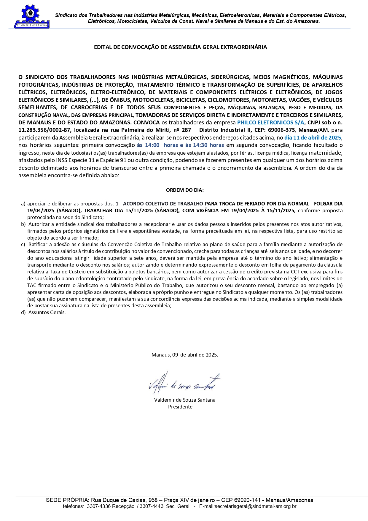 CONVOCAMOS OS TRABALHADORES PERTENCENTES A EMPRESA PHILCO ELETRÔNICOS S/A, CNPJ Nº 11.283.356/0002-87, LOCALIZADA NA RUA PALMEIRA DO MIRITI, Nº 287, BAIRRO DISTRITO INDUSTRIAL II, CEP 69006-373 – MANAUS-AM, PARA PARTICIPAREM DA ASSEMBLEIA GERAL EXTRAORDINÁRIA, À REALIZAR-SE NO RESPECTIVO ENDEREÇO CITADO ACIMA, NO DIA 11 DE ABRIL DE 2025, NOS SEGUINTES HORÁRIOS: PRIMEIRA CONVOCAÇÃO ÀS 14h00 HORAS E ÀS 14h30 MINUTOS EM SEGUNDA CONVOCAÇÃO.