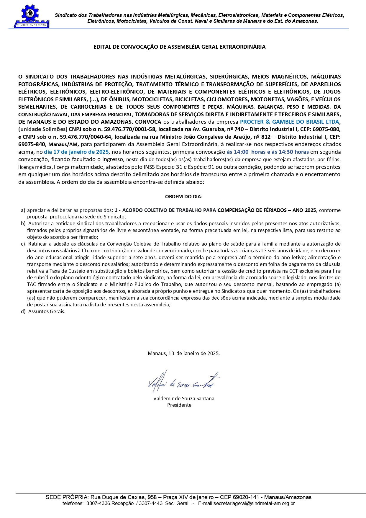 CONVOCAMOS OS TRABALHADORES PERTENCENTES A EMPRESA PROCTER & GAMBLE DO BRASIL LTDA, CNPJ SOB O Nº 59.476.770/0001-58, LOCALIZADA NA AV. GUARUBA, Nº 740 – DISTRITO INDUSTRIAL I, CEP: 69075-080 E PROCTER & GAMBLE DO BRASIL LTDA (UNIDADE SOLIMÕES), CNPJ SOB O Nº 59.476.770/0040-64, LOCALIZADA NA RUA MINISTRO JOÃO GONÇALVES DE ARAÚJO, Nº 812 – DISTRITO INDUSTRIAL I, CEP: 69075-840 , MANAUS/AM, PARA PARTICIPAREM DA ASSEMBLEIA GERAL EXTRAORDINÁRIA, À REALIZAR-SE NOS RESPECTIVOS ENDEREÇOS CITADOS ACIMA, NO DIA 17 DE JANEIRO DE 2025, NOS HORÁRIOS SEGUINTES: PRIMEIRA CONVOCAÇÃO ÀS 14:00 HORAS E ÀS 14:30 MINUTOS EM SEGUNDA CONVOCAÇÃO.