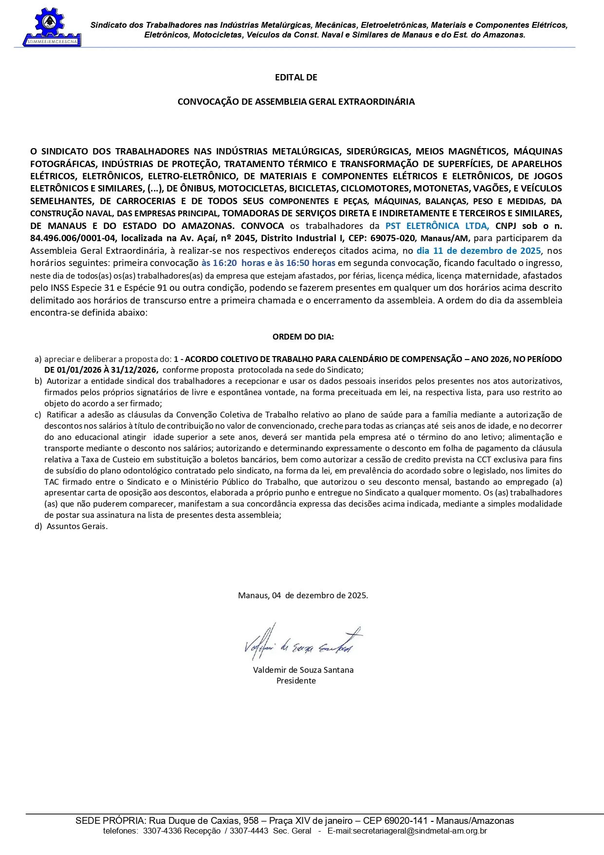 CONVOCAMOS OS TRABALHADORES PERTENCENTES A EMPRESA PST ELETRÔNICA LTDA, CNPJ Nº 84.496.066/0001-04, ESTABELECIDA NA AV. AÇAI, Nº 2045 LOTE 2-2 – DISTRITO INDUSTRIAL, CEP 69075-020, MANAUS/AM, PARA PARTICIPAREM DA ASSEMBLEIA GERAL EXTRAORDINÁRIA, A REALIZAR-SE NO RESPECTIVO ENDEREÇO CITADO ACIMA, NO DIA 11 DE DEZEMBRO DE 2025, NOS HORÁRIOS SEGUINTES: PRIMEIRA CONVOCAÇÃO ÀS 16h20 HORAS E ÀS 16h50 MINUTOS EM SEGUNDA CONVOCAÇÃO.