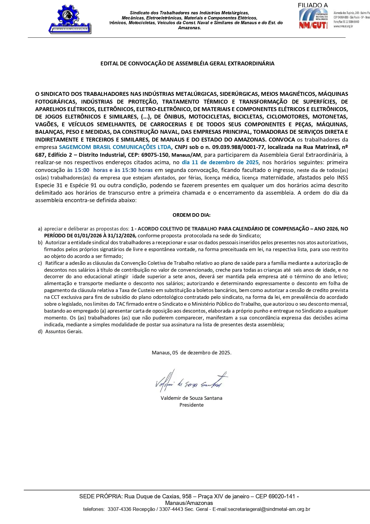 CONVOCAMOS OS TRABALHADORES PERTENCENTES A EMPRESA SAGEMCOM BRASIL COMUNICAÇÕES LTDA., CNPJ Nº 09.039.988/0001-77, LOCALIZADA NA AVENIDA MATRINXÃ, Nº 687 – EDIFÍCIO II – DISTRITO INDUSTRIAL, CEP 69075-150 – MANAUS-AM, PARA PARTICIPAREM DA ASSEMBLEIA GERAL EXTRAORDINÁRIA, À REALIZAR-SE NO RESPECTIVO ENDEREÇO CITADO ACIMA, NO DIA 11 DE DEZEMBRO DE 2025, NOS SEGUINTES HORÁRIOS: PRIMEIRA CONVOCAÇÃO ÀS 15h00 HORAS E ÀS 15h30 MINUTOS EM SEGUNDA CONVOCAÇÃO.