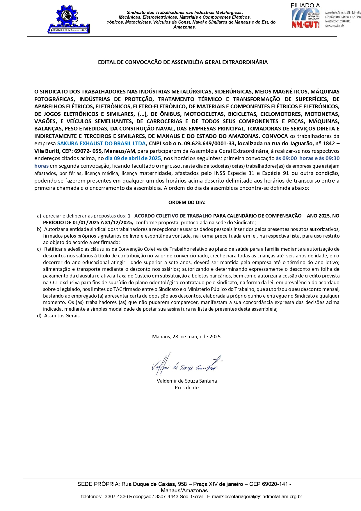 CONVOCAMOS OS TRABALHADORES PERTENCENTES A EMPRESA SAKURA EXHAUST DO BRASIL LTDA, CNPJ SOB O N. 09.623.649/0001-33, LOCALIZADA NA RUA RIO JAGUARÂO, Nº 1842 – VILA BURITI, CEP: 69072-055, MANAUS/AM, PARA PARTICIPAREM DA ASSEMBLEIA GERAL EXTRAORDINÁRIA, À REALIZAR-SE NOS RESPECTIVOS ENDEREÇOS CITADOS ACIMA, NO DIA 09 DE ABRIL DE 2025, NOS HORÁRIOS SEGUINTES: PRIMEIRA CONVOCAÇÃO ÀS 09H00 HORAS E ÀS 09H30 MINUTOS EM SEGUNDA CONVOCAÇÃO.