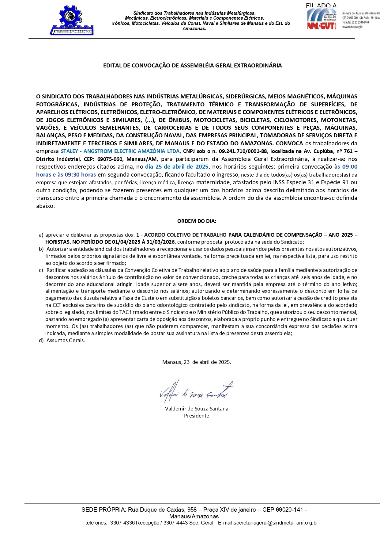 CONVOCAMOS OS TRABALHADORES PERTENCENTES A EMPRESA STANLEY ANGSTROM ELÉCTRIC LTDA, CNPJ 09.241.710/0001-88, LOCALIZADA COM SEDE NA AVENIDA CUPIÚBA, Nº 761, DISTRITO INDUSTRIAL, CEP 69075- 060, MANAUS/AM, PARA PARTICIPAREM DA ASSEMBLEIA GERAL EXTRAORDINÁRIA, A REALIZAR-SE NO RESPECTIVO ENDEREÇO CITADO ACIMA, NO DIA 25 DE ABRIL DE 2025, NOS HORÁRIOS SEGUINTES: PRIMEIRA CONVOCAÇÃO ÀS 09h00 HORAS E ÀS 09h30 MINUTOS EM SEGUNDA CONVOCAÇÃO.