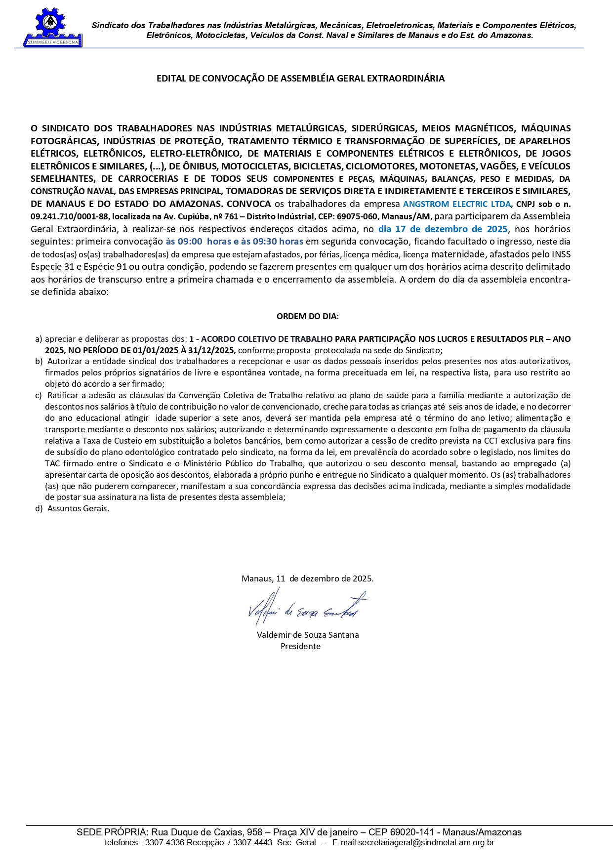 CONVOCAMOS OS TRABALHADORES PERTENCENTES A EMPRESA STANLEY ANGSTROM ELÉCTRIC LTDA, CNPJ 09.241.710/0001-88, LOCALIZADA COM SEDE NA AVENIDA CUPIÚBA, Nº 761, DISTRITO INDUSTRIAL, CEP 69075- 060, MANAUS/AM, PARA PARTICIPAREM DA ASSEMBLEIA GERAL EXTRAORDINÁRIA, A REALIZAR-SE NO RESPECTIVO ENDEREÇO CITADO ACIMA, NO DIA 17 DE DEZEMBRO DE 2025, NOS HORÁRIOS SEGUINTES: PRIMEIRA CONVOCAÇÃO ÀS 09h00 HORAS E ÀS 09h30 MINUTOS EM SEGUNDA CONVOCAÇÃO.