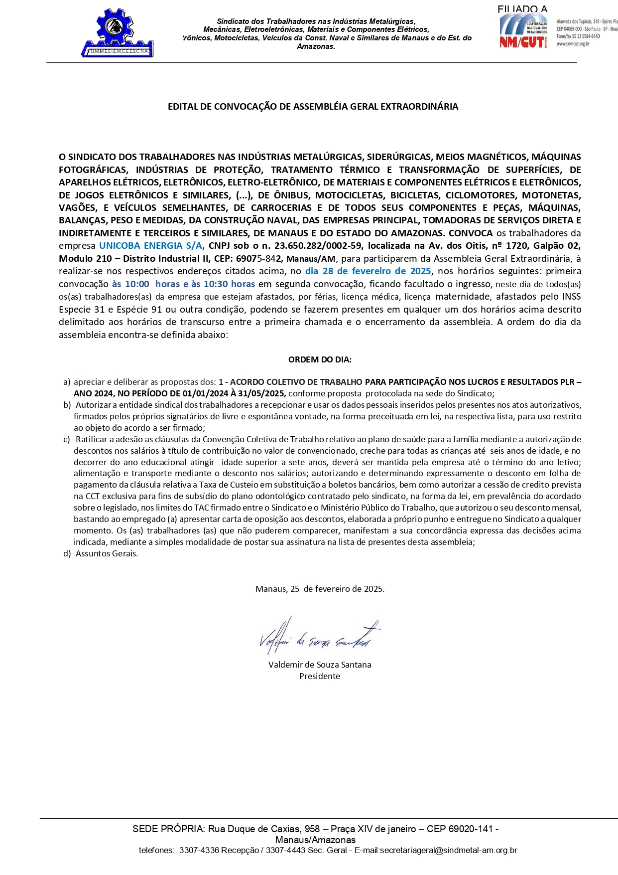 CONVOCAMOS OS TRABALHADORES PERTENCENTES A EMPRESA UNICOBA ENERGIA S/A., CNPJ Nº 23.650.282/0002-59, ESTABELECIDA NA AVENIDA DOS OITIS, Nº 1720 – GALPÃO 2, MÓDULO 210, BAIRRO DISTRITO INDUSTRIAL II, CEP 69007-002-59 – MANAUS-AM, PARA PARTICIPAREM DA ASSEMBLEIA GERAL EXTRAORDINÁRIA, À REALIZAR-SE NO RESPECTIVO ENDEREÇO CITADO ACIMA, NO DIA 28 DE FEVEREIRO DE 2025 NOS SEGUINTES HORÁRIOS: PRIMEIRA CONVOCAÇÃO ÀS 10h00 HORAS E ÀS 10h30 MINUTOS EM SEGUNDA CONVOCAÇÃO.