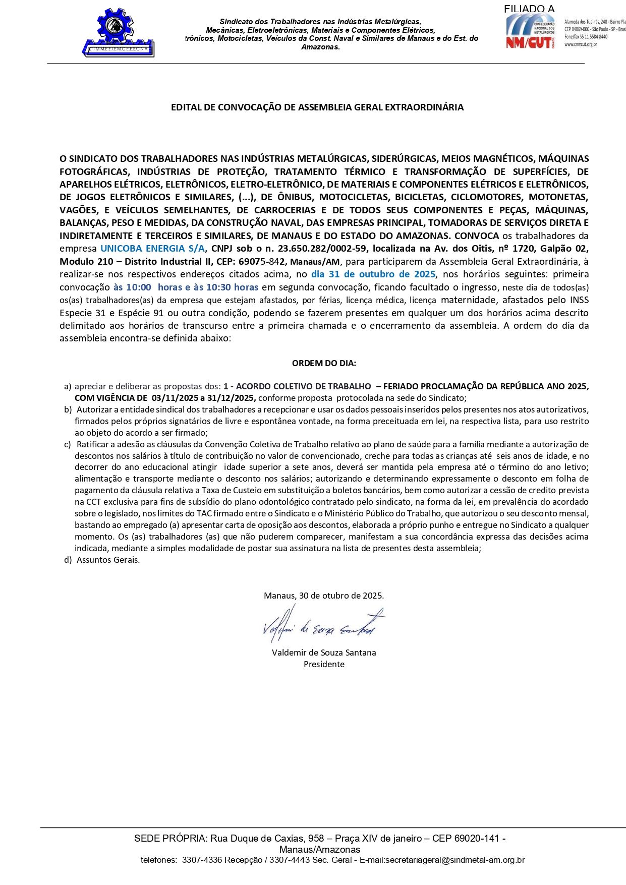 CONVOCAMOS OS TRABALHADORES PERTENCENTES A EMPRESA UNICOBA ENERGIA S.A., CNPJ Nº 23.650.282/0002-59, ESTABELECIDA NA AVENIDA DOS OITIS, Nº 1720 – GALPÃO 2, MÓDULO 210, BAIRRO DISTRITO INDUSTRIAL II, CEP 69007-002-59 – MANAUS-AM, PARA PARTICIPAREM DA ASSEMBLEIA GERAL EXTRAORDINÁRIA, À REALIZAR-SE NO RESPECTIVO ENDEREÇO CITADO ACIMA, NO DIA 31 DE OUTUBRO DE 2025, NOS SEGUINTES HORÁRIOS: PRIMEIRA CONVOCAÇÃO ÀS 10h00 HORAS E ÀS 10h30 MINUTOS EM SEGUNDA CONVOCAÇÃO.