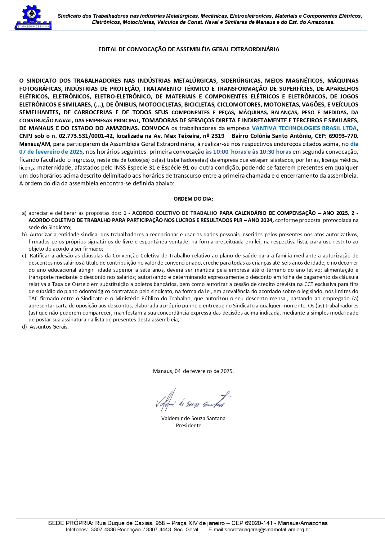 CONVOCAMOS OS TRABALHADORES PERTENCENTES A EMPRESA VANTIVA TECHNOLOGIES BRASIL LTDA, CNPJ SOB O Nº 02.773.531/0001-42, LOCALIZADA NA AVENIDA MAX TEIXEIRA Nº 2319 – BAIRRO COLÔNIA SANTO ANTÔNIO, CEP 69093-770, MANAUS/AM, PARA PARTICIPAREM DA ASSEMBLEIA GERAL EXTRAORDINÁRIA, À REALIZAR-SE NO RESPECTIVO ENDEREÇO CITADO ACIMA, NO DIA 07 FEVEREIRO DE 2024, NOS SEGUINTES HORÁRIOS: PRIMEIRA CONVOCAÇÃO ÀS 10h00 HORAS E ÀS 10h30 MINUTOS EM SEGUNDA CONVOCAÇÃO.