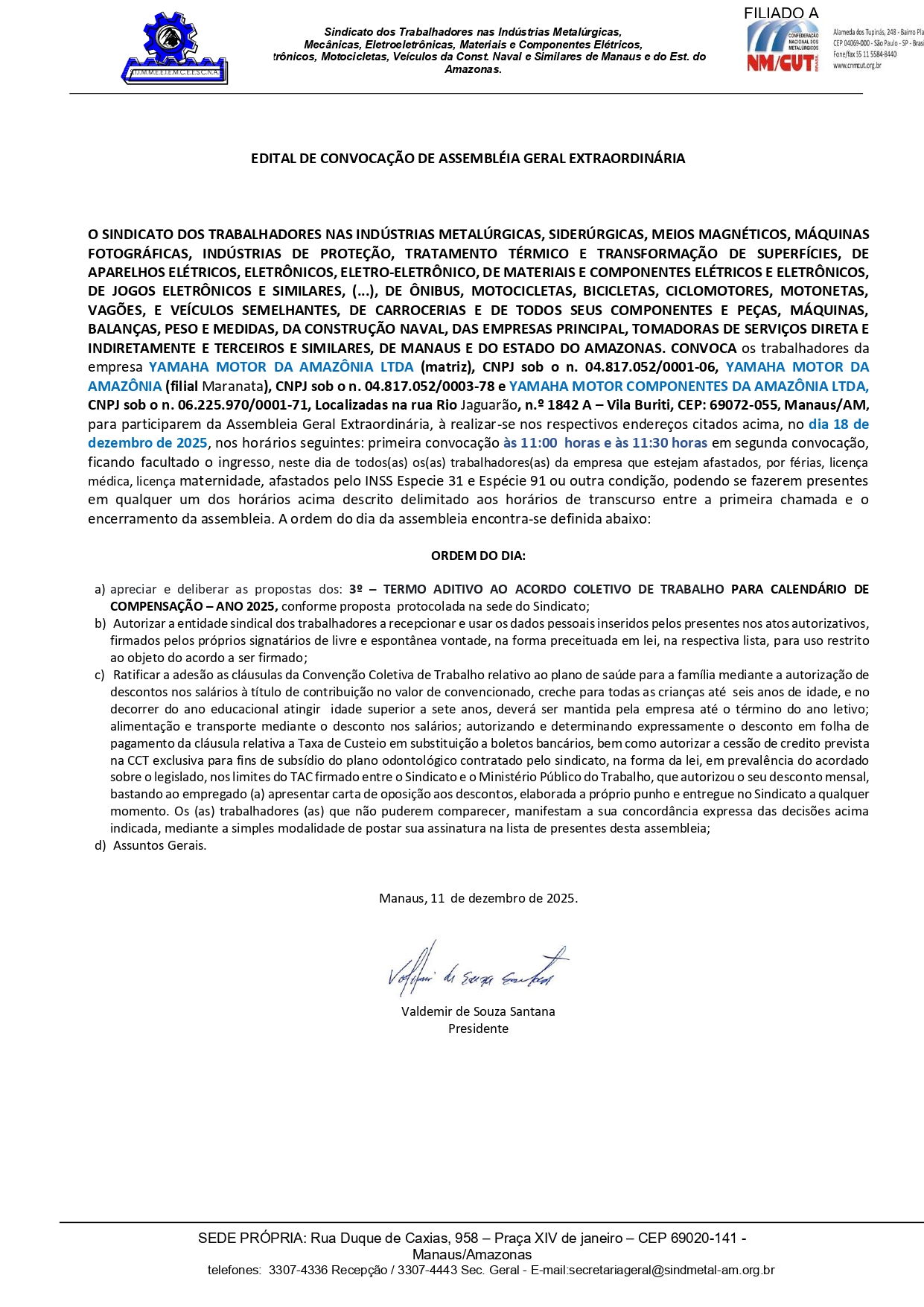 CONVOCAMOS OS TRABALHADORES PERTENCENTES A EMPRESA, YAMAHA MOTOR DA AMAZÔNIA LTDA (matriz), CNPJ sob o n. 04.817.052/0001-06, YAMAHA MOTOR DA AMAZÔNIA (filial Maranata), CNPJ sob o n. 04.817.052/0003-78 e YAMAHA MOTOR COMPONENTES DA AMAZÔNIA LTDA, CNPJ sob o n. 06.225.970/0001-71, Localizadas na rua Rio Jaguarão, n.º 1842 A – Vila Buriti, CEP: 69072-055, Manaus/AM, PARA PARTICIPAREM DA ASSEMBLEIA GERAL EXTRAORDINÁRIA, A REALIZAR-SE NO RESPECTIVO ENDEREÇO CITADO ACIMA, NO DIA 18 DE DEZEMBRO DE 2025, NOS SEGUINTES HORÁRIOS: PRIMEIRA CONVOCAÇÃO ÀS 11H00 MINUTOS E ÀS 11H30 HORAS EM SEGUNDA CONVOCAÇÃO.