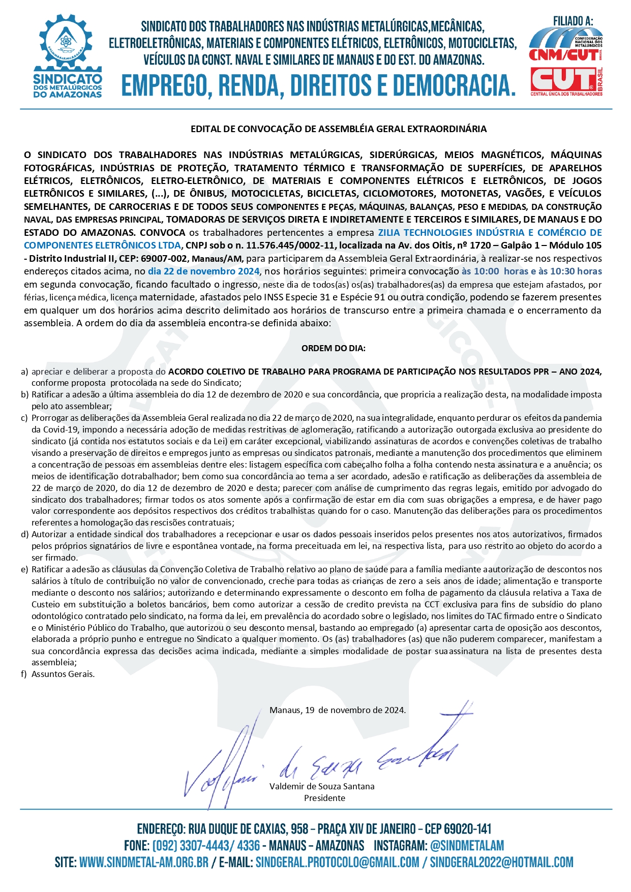 CONVOCAMOS OS TRABALHADORES PERTENCENTES A EMPRESA, ZILIA TECHNOLOGIES INDÚSTRIA E COMÉRCIO DE COMPONENTES ELÉTRÔNICOS LTDACNPJ SOB O Nº 11.576.445/0002-11, LOCALIZADA NA AV. DOS OITIS, 1720 – GALPÃO I – MÓDULO 105 – DISTRITO INDUSTRIAL, CEP: 69007- 002, MANAUS/AM, PARA PARTICIPAREM DA ASSEMBLEIA GERAL EXTRAORDINÁRIA, A REALIZAR-SE NO RESPECTIVO ENDEREÇO CITADO ACIMA, NO DIA 22 DE NOVEMBRO DE 2024, NOS SEGUINTES HORÁRIOS: PRIMEIRA CONVOCAÇÃO ÀS 10H00 MINUTOS E ÀS 10H30 MINUTOS EM SEGUNDA CONVOCAÇÃO.